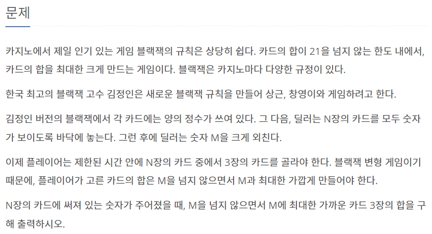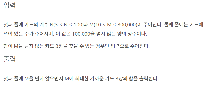주어진 N장의 카드 중 3장을 골라 M 미만의 가장 큰 3장의 합을 구하면 된다.