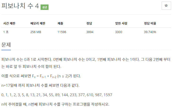 피보나치 수는 0과 1로 시작한다. 0번째 피보나치 수는 0이고, 1번째 피보나치 수는 1이다. 그 다음 2번째 부터는 바로 앞 두 피보나치 수의 합이 된다. 이를 식으로 써보면 Fn = Fn-1 + Fn-2 (n ≥ 2)가
